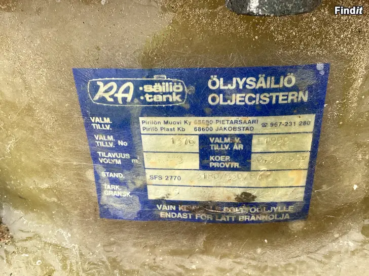Hyväkuntoinen öljysäiliö on valmistettu vuonna 1990 Pietarsaaressa.